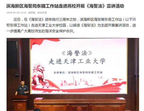 近日,在《海警法》颁布施行三周年之际,滨海新区海警局东疆工作站(以下简称东疆工作站)走进天津工业大学校园,以解读《海警法》为主题开展宣讲活动,进一步提高广大高校师生的海洋安全保护意识。