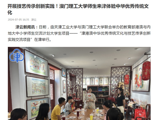 津云新闻讯:日前,由天津工业大学与澳门理工大学联合举办的教育部港澳与内地大中小学师生交流计划大学生项目——“津港澳中华优秀传统文化与技艺传承创新实践交流项目”在津举行。