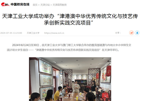 2024年6月24日至30日,由天津工业大学与澳门理工大学联合举办的教育部港澳与内地大中小学师生交流计划大学生项目——“津港澳中华优秀传统文化与技艺传承创新实践交流项目”在天津市举行。