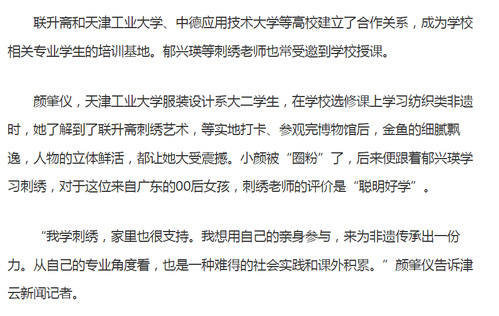 “我学刺绣,家里也很支持。我想用自己的亲身参与,来为非遗传承出一份力。从自己的专业角度看,也是一种难得的社会实践和课外积累。”颜肇仪告诉津云新闻记者。