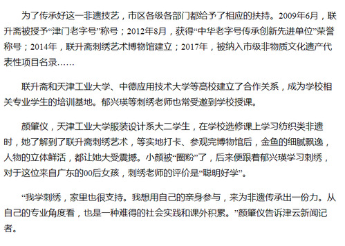 为了传承好这一非遗技艺,市区各级各部门都给予了相应的扶持。20096月,联升斋被授予“津门老字号”称号;20128月,获得“中华老字号传承创新先进单位”荣誉称号;2014年,联升斋刺绣艺术博物馆建立;2017年,被纳入市级非物质文化遗产代表性项目名录……