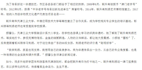 联升斋和天津工业大学、中德应用技术大学等高校建立了合作关系,成为学校相关专业学生的培训基地。郁兴瑛等刺绣老师也常受邀到学校授课。