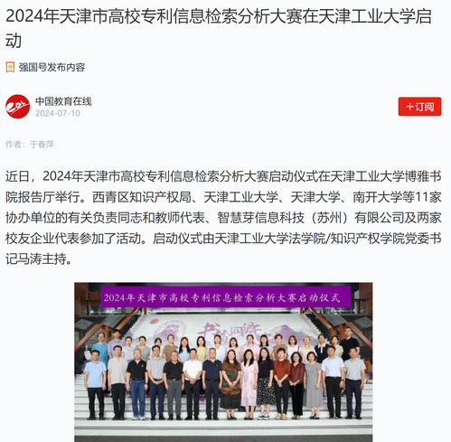 近日,2024年天津市高校专利信息检索分析大赛启动仪式在天津工业大学博雅书院报告厅举行。西青区知识产权局、天津工业大学、天津大学、南开大学等11家协办单位的有关负责同志和教师代表、智慧芽信息科技(苏州)有限公司及两家校友企业代表参加了活动。启动仪式由天津工业大学法学院/知识产权学院党委书记马涛主持。