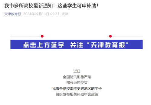 我市多所高校最新通知:这些学生可申补助!全国防汛形势严峻部分地区受灾我市各高校牵挂受灾地区的学子纷纷发布相关补助申领政策天津工业大学学生家庭如因决堤灾害造成人员伤害或经济损失,导致家庭经济出现临时困难的,可随时与学校辅导员联系并说明情况,申请临时困难补助。(详情)此外,如有同学遇到其他各类紧急灾害、突发事件(不限于决堤灾害),均可及时联系所在学院的辅导员申请。遇紧急特殊情况的,也可以与学生管理资助中心联系。资助热线:022-83955139
