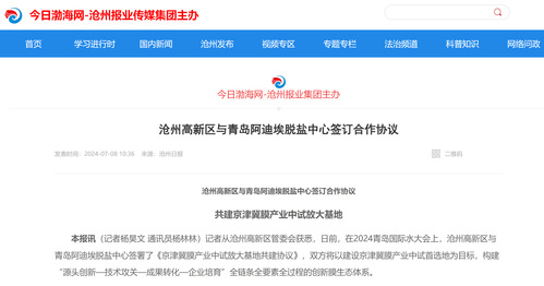 今日渤海网丨沧州高新区与青岛阿迪埃脱盐中心签订合作协议