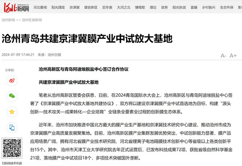 笔者从沧州高新区管委会获悉,日前,在2024青岛国际水大会上,沧州高新区与青岛阿迪埃脱盐中心签署了《京津冀膜产业中试放大基地共建协议》,双方将以建设京津冀膜产业中试首选地为目标,构建“源头创新—技术攻关—成果转化—企业培育”全链条全要素全过程的创新膜生态体系。