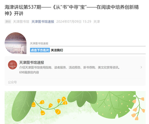 “奋进新征程 建功新时代”——《海津讲坛》第537期于2024年7月6日上午在天津图书馆复康路馆区二楼报告厅如期举行。本场讲座由天津市文化和旅游局、天津市社会科学界联合会主办,天津图书馆承办。天津工业大学团委降凌楠老师应邀担任主讲嘉宾,为到场读者讲述《从“书”中寻“宝”——在阅读中培养创新精神》。