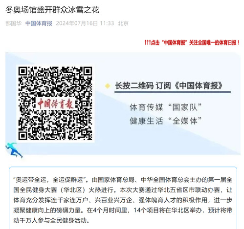“奥运带全运,全运促群运”。由国家体育总局、中华全国体育总会主办的第一届全国全民健身大赛(华北区)火热进行。本次大赛通过华北五省区市联动办赛,让体育充分发挥连千家连万户、兴百业兴万企、强体魄育人才的积极作用,进一步凝聚健康向上的磅礴力量。在4个月时间里,14个项目将在华北区举办,预计将带动千万人参与全民健身活动。