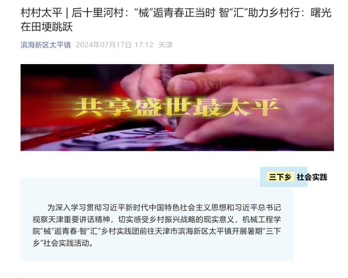 为深入学习贯彻习近平新时代中国特色社会主义思想和习近平总书记视察天津重要讲话精神,切实感受乡村振兴战略的现实意义,机械工程学院“械”逅青春·智“汇”乡村实践团前往天津市滨海新区太平镇开展暑期“三下乡”社会实践活动。
