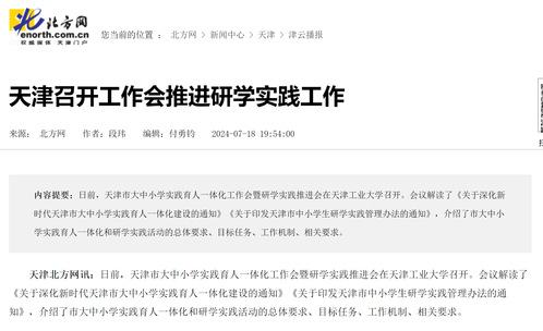 天津北方网讯:日前,天津市大中小学实践育人一体化工作会暨研学实践推进会在天津工业大学召开。会议解读了《关于深化新时代天津市大中小学实践育人一体化建设的通知》《关于印发天津市中小学生研学实践管理办法的通知》,介绍了市大中小学实践育人一体化和研学实践活动的总体要求、目标任务、工作机制、相关要求。
