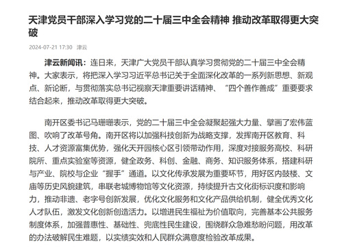 津云新闻讯:连日来,天津广大党员干部认真学习贯彻党的二十届三中全会精神。大家表示,将把深入学习习近平总书记关于全面深化改革的一系列新思想、新观点、新论断,与贯彻落实总书记视察天津重要讲话精神、“四个善作善成”重要要求结合起来,推动改革取得更大突破。