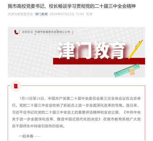 党的二十届三中全会的胜利召开,为进一步全面深化改革指明了方向、提供了根本遵循。全会用三个“深化”给出了“统筹推进教育科技人才体制机制一体改革”的实践路径。学校党委将认真贯彻落实全会重要要求,锚定教育改革目标,聚焦高质量发展这一首要任务,大力推进学校治理体系和治理能力现代化,在建设教育强国的新征程上回答好“培养什么人、怎样培养人、为谁培养人”这一根本问题,加快建设具有中国特色“双一流”高水平大学,全力答好改革题、走好创新路,为奋力谱写中国式现代化天津篇章,全面推进强国建设、民族复兴伟业贡献天工智慧和力量。