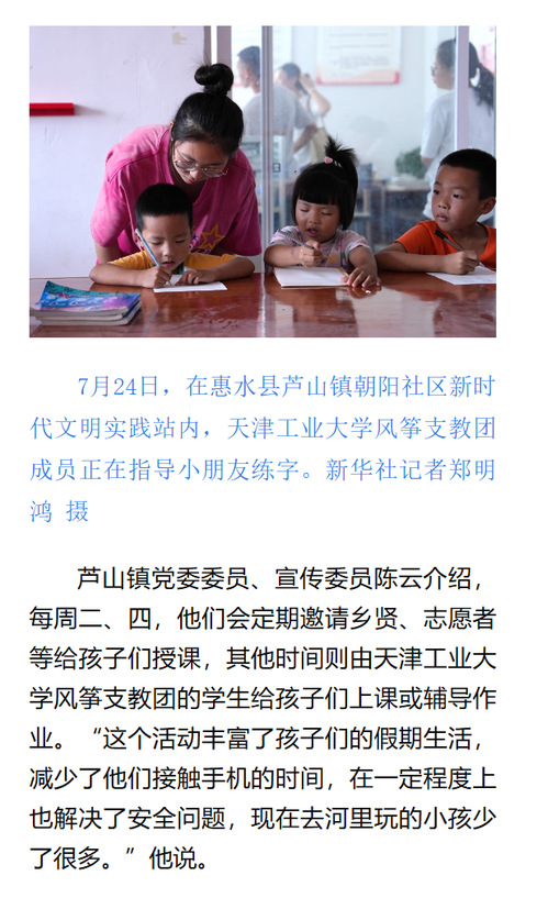 芦山镇党委委员、宣传委员陈云介绍,每周二、四,他们会定期邀请乡贤、志愿者等给孩子们授课,其他时间则由天津工业大学风筝支教团的学生给孩子们上课或辅导作业。“这个活动丰富了孩子们的假期生活,减少了他们接触手机的时间,在一定程度上也解决了安全问题,现在去河里玩的小孩少了很多。”他说。