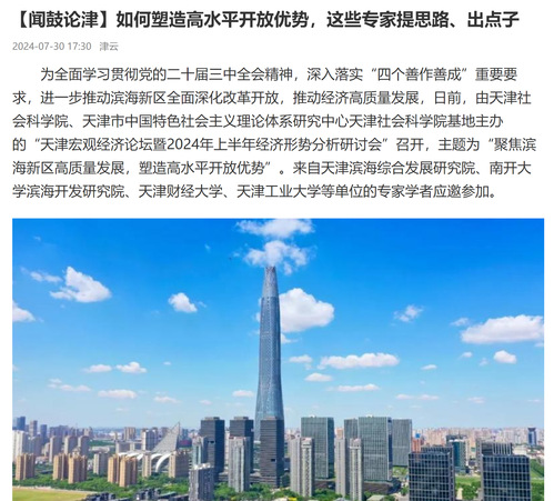 天津社会科学院党组成员、副院长、研究员 王双  党的二十届三中全会围绕进一步全面深化改革、推进中国式现代化作出战略部署。今年2月,习近平总书记亲临天津视察,提出天津要在进一步全面深化改革开放上善作善成的重要要求。75日,国务院常务会议研究支持天津滨海新区高质量发展的政策措施。此次研讨会是深入贯彻党的二十届三中全会部署的重要举措,是全面落实习近平总书记视察天津重要讲话精神的重要举措,是推动滨海新区高质量发展迈出更大步伐的重要举措。滨海新区作为支撑引领天津发展的重要引擎,同时也是中国改革开放的重要窗口,应充分利用其独特的区位优势、政策优势和创新优势,进一步推动全面深化改革开放,积极探索新的发展模式和路径,通过优化资源配置、创新体制机制、提升开放水平等多措并举,不断激发区域发展活力,为全国乃至全球的经济发展贡献更多“滨海智慧”和“滨海方案”。