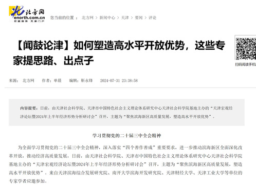 为全面学习贯彻党的二十届三中全会精神,深入落实“四个善作善成”重要要求,进一步推动滨海新区全面深化改革开放,推动经济高质量发展,日前,由天津社会科学院、天津市中国特色社会主义理论体系研究中心天津社会科学院基地主办的“天津宏观经济论坛暨2024年上半年经济形势分析研讨会”召开,主题为“聚焦滨海新区高质量发展,塑造高水平开放优势”。来自天津滨海综合发展研究院、南开大学滨海开发研究院、天津财经大学、天津工业大学等单位的专家学者应邀参加。