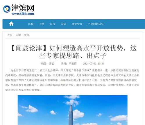 为全面学习贯彻党的二十届三中全会精神,深入落实“四个善作善成”重要要求,进一步推动滨海新区全面深化改革开放,推动经济高质量发展,日前,由天津社会科学院、天津市中国特色社会主义理论体系研究中心天津社会科学院基地主办的“天津宏观经济论坛暨2024年上半年经济形势分析研讨会”召开,主题为“聚焦滨海新区高质量发展,塑造高水平开放优势”。来自天津滨海综合发展研究院、南开大学滨海开发研究院、天津财经大学、天津工业大学等单位的专家学者应邀参加。
