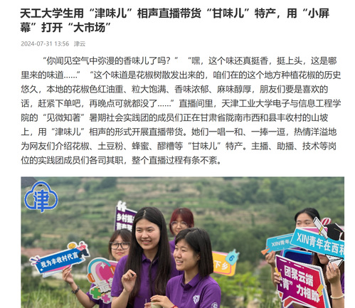 “你闻见空气中弥漫的香味儿了吗?”“嘿,这个味还真挺香,挺上头,这是哪里来的味道……”“这个味道是花椒树散发出来的,咱们在的这个地方种植花椒的历史悠久,本地的花椒色红油重、粒大饱满、香味浓郁、麻味醇厚,朋友们要是喜欢的话,赶紧下单吧,再晚点可就都没了……”直播间里,天津工业大学电子与信息工程学院的“见微知著”暑期社会实践团的成员们正在甘肃省陇南市西和县丰收村的山坡上,用“津味儿”相声的形式开展直播带货。她们一唱一和、一捧一逗,热情洋溢地为网友们介绍花椒、土豆粉、蜂蜜、醪糟等“甘味儿”特产。主播、助播、技术等岗位的实践团成员们各司其职,整个直播过程有条不紊。