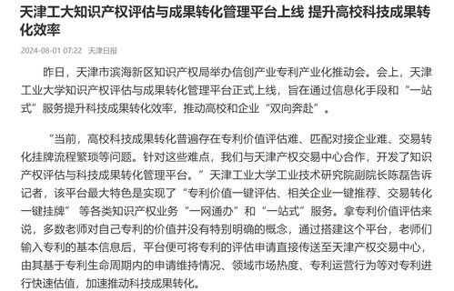 天津工大知识产权评估与成果转化管理平台上线 提升高校科技成果转化效率