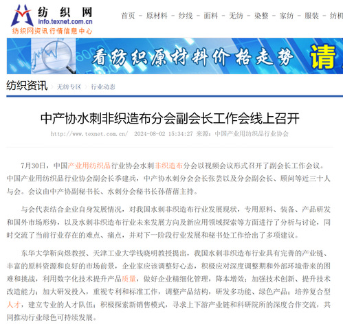 7月30日,中国产业用纺织品行业协会水刺非织造布分会以视频会议形式召开了副会长工作会议。中国产业用纺织品行业协会副会长季建兵,中产协水刺分会会长张芸以及分会副会长、顾问等近三十人与会。会议由中产协副秘书长、水刺分会秘书长孙蓓蓓主持。