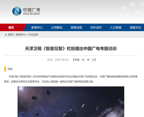 天津卫视《智者见智》2024世界智能产业博览会特别节目近日播出中国广电专题访谈,中国广播电视网络集团有限公司党委委员、监事会主席宋文玉接受专访,与主持人蒋昌建一起探讨中国广电的转型发展之路。