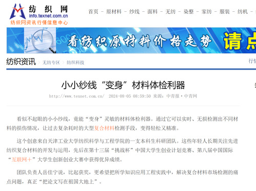 这个创意来自天津工业大学纺织科学与工程学院的一支本科生科研团队。这些年轻人长期关注先进纺织复合材料的开发与运用,先后在第十三届“挑战杯”中国大学生创业计划竞赛、第八届中国国际“互联网+”大学生创新创业大赛中获得优异成绩。
