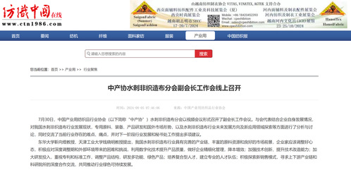 7月30日,中国产业用纺织品行业协会(以下简称“中产协”)水刺非织造布分会以视频会议形式召开了副会长工作会议。与会代表结合企业自身发展情况,对我国水刺非织造布行业发展现状,专用原料、装备、产品研发和国外市场形势,以及水刺非织造布行业未来发展方向及新应用领域探索等方面进行了分析与讨论,同时交流了当前行业存在的难点、痛点,并对下一阶段行业发展和秘书处工作提出多项建议。