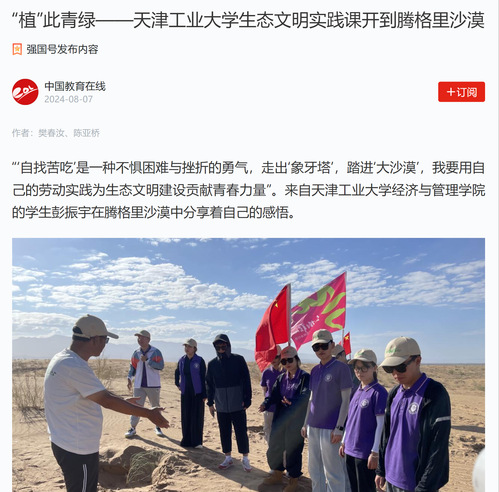 为动员广大青年学子以实际行动践行生态文明理念、服务乡村振兴战略,今年暑期,天津工业大学卓越管理者培养计划学员们组成“自找苦吃担使命,‘植’此青绿当先锋”实践团,前往内蒙古自治区阿拉善盟,开展绿色科考、生态宣讲和种树植心行动。