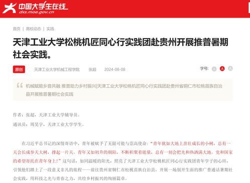 在习近平总书记的深情寄语中,青年被赋予了无限可能与崇高使命:“青年犹如大地上茁壮成长的小树,总有一天会长成参天大树,撑起一片天。青年又如初升的朝阳,不断积聚着能量,总有一刻会把光和热洒满大地。党和国家的希望寄托在青年身上!”这句话,如同温暖的阳光,照亮了天津工业大学松桃机匠同心行实践团青年学子的心田,引领他们踏上了一段意义非凡的旅程——前往贵州省铜仁市松桃苗族自治县,开展一场别开生面的推广普通话暑期社会实践,用科技之光与青春之力,共绘乡村振兴的绚丽篇章。