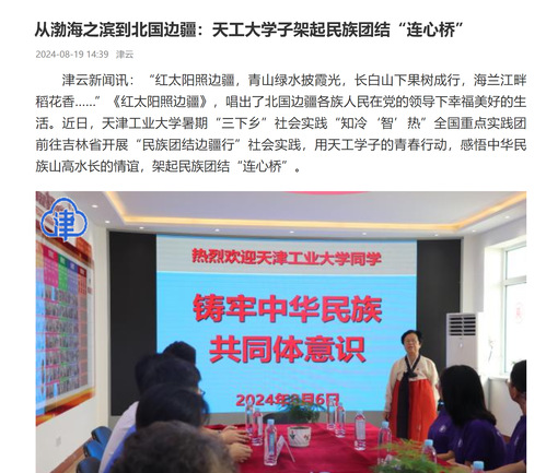 津云新闻讯:“红太阳照边疆,青山绿水披霞光,长白山下果树成行,海兰江畔稻花香……”《红太阳照边疆》,唱出了北国边疆各族人民在党的领导下幸福美好的生活。近日,天津工业大学暑期“三下乡”社会实践“知冷‘智’热”全国重点实践团前往吉林省开展“民族团结边疆行”社会实践,用天工学子的青春行动,感悟中华民族山高水长的情谊,架起民族团结“连心桥”。