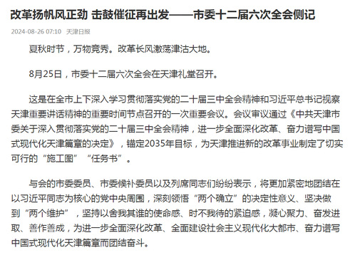 这是在全市上下深入学习贯彻落实党的二十届三中全会精神和习近平总书记视察天津重要讲话精神的重要时间节点召开的一次重要会议。会议审议通过《中共天津市委关于深入贯彻落实党的二十届三中全会精神,进一步全面深化改革、奋力谱写中国式现代化天津篇章的决定》,锚定2035年目标,为天津推进新的改革事业制定了切实可行的“施工图”“任务书”。