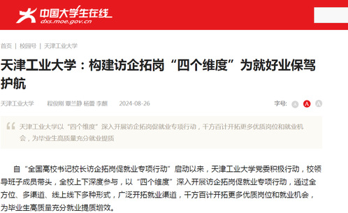 自“全国高校书记校长访企拓岗促就业专项行动”启动以来,天津工业大学党委积极行动,校领导班子成员带头,全校上下深度参与,以“四个维度”深入开展访企拓岗促就业专项行动,通过全方位、多渠道、线上线下多种形式,广泛开拓就业渠道,千方百计开拓更多优质岗位和就业机会,为毕业生高质量充分就业提质增效。