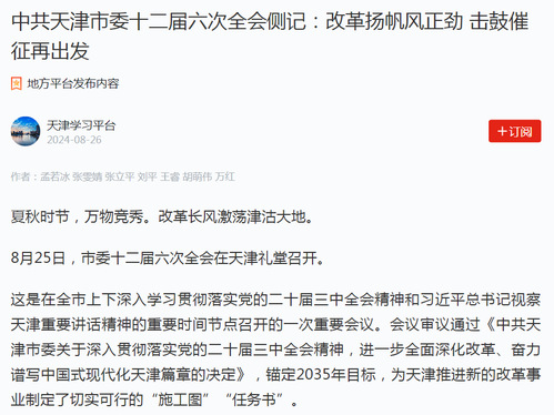 这是在全市上下深入学习贯彻落实党的二十届三中全会精神和习近平总书记视察天津重要讲话精神的重要时间节点召开的一次重要会议。会议审议通过《中共天津市委关于深入贯彻落实党的二十届三中全会精神,进一步全面深化改革、奋力谱写中国式现代化天津篇章的决定》,锚定2035年目标,为天津推进新的改革事业制定了切实可行的“施工图”“任务书”。