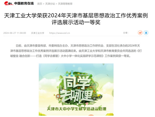 日前,由天津市委宣传部、市委网信办主办,天津市思想政治工作研究会、支部生活社承办的2024年天津市基层思想政治工作优秀案例评选展示活动圆满结束。由天津工业大学和天津市教育委员会共同选送的《打破壁垒 融合创新——打造〈同学去哪里〉大中小学一体化实践研学示范课程》工作案例荣获一等奖。