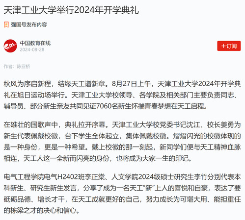 秋风为序启新程,结缘天工谱新章。8月27日上午,天津工业大学2024年开学典礼在旭日运动场举行。天津工业大学校领导、各学院及相关部门主要负责同志、辅导员、部分新生亲友共同见证7060名新生怀揣青春梦想在天工启程。