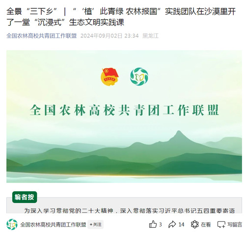 为深入学习贯彻党的二十大精神,深入贯彻落实习近平总书记五四重要寄语精神和给中国农业大学科技小院的同学们的回信精神,动员广大高校青年学生践行生态文明理念、服务乡村振兴战略,在农林报国的生动实践中“受教育、长才干、作贡献”,由全国农林高校共青团工作联盟主办、东北林业大学承办的“自找苦吃担使命 农林报国当先锋”2024年全国大学生暑期文化科技卫生“三下乡”社会实践专项活动正在全国范围内火热开展中。