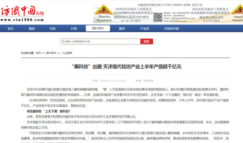 近年来,天津纺织企业和科研院所围绕纺织新材料研发应用、生产流程、智能制造等方面协作创新,促进产业向智能化、高端化方向转型升级。天津天纺投资控股有限公司开发的棉铜氨涤异经强捻面料、多功能天竹系列等26个项目均达到国内领先水平;天纺标检测认证股份有限公司已形成碎样机、耐腐蚀水浴摇床、近红外无损检测模型、皂洗自动分液机等众多核心技术和产品,在特定领域引领我国纺织品检测行业达到国际领先水平,项目研究成果填补了多项国内外空白。