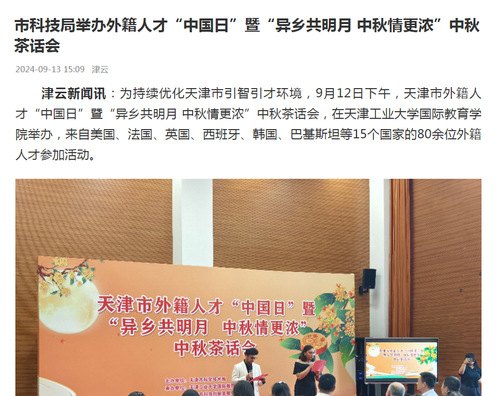 津云新闻讯:为持续优化天津市引智引才环境,9月12日下午,天津市外籍人才“中国日”暨“异乡共明月 中秋情更浓”中秋茶话会,在天津工业大学国际教育学院举办,来自美国、法国、英国、西班牙、韩国、巴基斯坦等15个国家的80余位外籍人才参加活动。