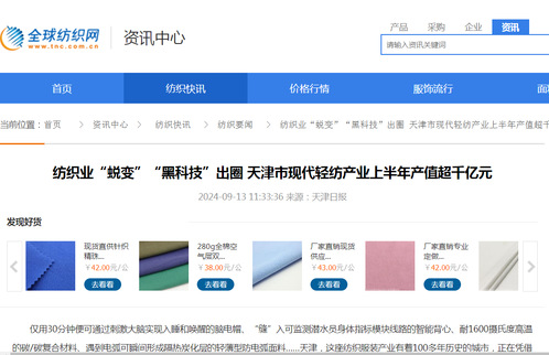 纺织业“蜕变”“黑科技”出圈 天津市现代轻纺产业上半年产值超千亿元