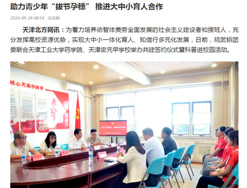 天津北方网讯:为着力培养德智体美劳全面发展的社会主义建设者和接班人,充分发挥高校资源优势,实现大中小一体化育人、知信行多元化发展,日前,精武镇团委联合天津工业大学药学院、天津霍元甲学校举办共建签约仪式暨科普进校园活动。
