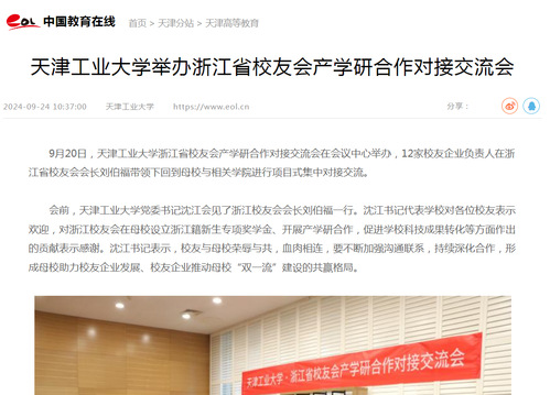 9月20日,天津工业大学浙江省校友会产学研合作对接交流会在会议中心举办,12家校友企业负责人在浙江省校友会会长刘伯福带领下回到母校与相关学院进行项目式集中对接交流。