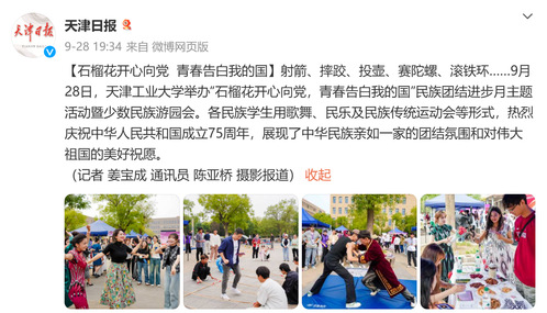 【石榴花开心向党 青春告白我的国】射箭、摔跤、投壶、赛陀螺、滚铁环……9月28日,天津工业大学举办“石榴花开心向党,青春告白我的国”民族团结进步月主题活动暨少数民族游园会。各民族学生用歌舞、民乐及民族传统运动会等形式,热烈庆祝中华人民共和国成立75周年,展现了中华民族亲如一家的团结氛围和对伟大祖国的美好祝愿。(记者 姜宝成 通讯员 陈亚桥 摄影报道)