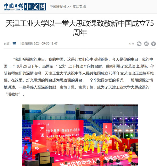 “我们祝福你的生日,我的中国,这是儿女们心中期望的歌,今天是你的生日,我的中国……”9月29日下午,当两条“飞龙”上下舞动奔向舞台时,瞬间引爆了文艺演出现场。伴随着师生们的深情演唱,天津工业大学庆祝中华人民共和国成立75周年文艺演出正式拉开帷幕。在这里,灯光熠熠的舞台成为思政课的讲台,一个个激昂慷慨的唱词、一段段娓娓动情地讲述、一幕幕感人至深的舞蹈,寓情于景、寓景于情,成为了天津工业大学大思政课的“活教材”。
