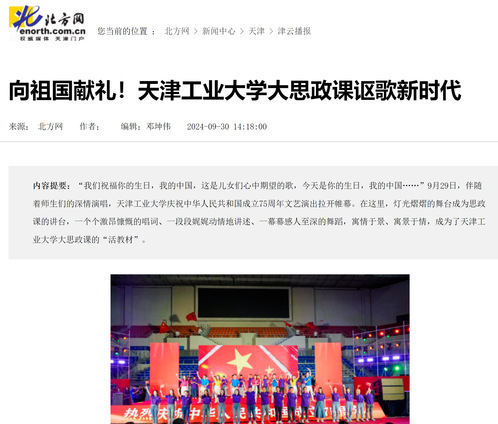 天津北方网讯:“我们祝福你的生日,我的中国,这是儿女们心中期望的歌,今天是你的生日,我的中国……”9月29日,伴随着师生们的深情演唱,天津工业大学庆祝中华人民共和国成立75周年文艺演出拉开帷幕。在这里,灯光熠熠的舞台成为思政课的讲台,一个个激昂慷慨的唱词、一段段娓娓动情地讲述、一幕幕感人至深的舞蹈,寓情于景、寓景于情,成为了天津工业大学大思政课的“活教材”。
