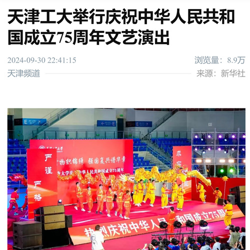 新华社客户端天津9月30日电(记者李然)近日,天津工业大学庆祝中华人民共和国成立75周年文艺演出在校体育馆举行。
