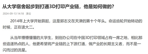 从当年懵懵懂懂的大学生,到创办公司在中国3D打印领域占有一席之地,相比那些追逐热点的人,他更希望将产业链的上下游打通,做产业的长期主义者,而不是一闪而过的流星。