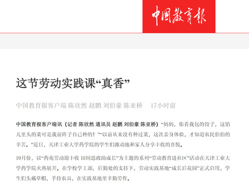 中国教育报客户端讯(记者 陈欣然 通讯员 赵鹏 刘伯豪 陈亚桥)“妈妈,你看我包的饺子,这馅儿里头的菜可是我前阵子自己种的!”“以前从来没有种过菜,这次亲身体验,才知道农民伯伯的辛苦。”近日,天津工业大学药学院的学生们激动地和家人分享丰收的喜悦。