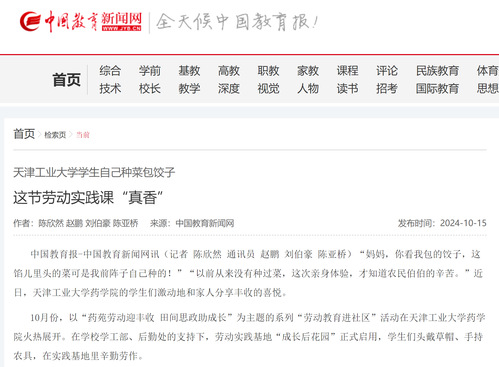 中国教育报-中国教育新闻网讯(记者 陈欣然 通讯员 赵鹏 刘伯豪 陈亚桥)“妈妈,你看我包的饺子,这馅儿里头的菜可是我前阵子自己种的!”“以前从来没有种过菜,这次亲身体验,才知道农民伯伯的辛苦。”近日,天津工业大学药学院的学生们激动地和家人分享丰收的喜悦。
