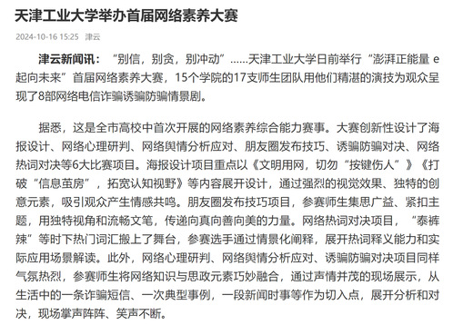 津云新闻讯:“别信,别贪,别冲动”……天津工业大学日前举行“澎湃正能量 e起向未来”首届网络素养大赛,15个学院的17支师生团队用他们精湛的演技为观众呈现了8部网络电信诈骗诱骗防骗情景剧。