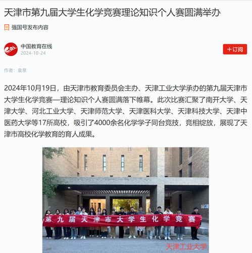 20241019日,由天津市教育委员会主办、天津工业大学承办的第九届天津市大学生化学竞赛—理论知识个人赛圆满落下帷幕。此次比赛汇聚了南开大学、天津大学、河北工业大学、天津师范大学、天津医科大学、天津科技大学、天津中医药大学等17所高校,吸引了4000余名化学学子同台竞技,竞相绽放,展现了天津市高校化学教育的育人成果。