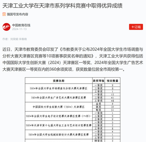 近日,天津市教育委员会印发了《市教委关于公布2024年全国大学生市场调查与分析大赛天津赛区竞赛等10项赛事获奖名单的通知》,天津工业大学共获得包括中国国际大学生创新大赛(2024)天津赛区一等奖、2024年全国大学生广告艺术大赛天津赛区一等奖在内的360余项奖项,获奖数量位居全市高校第一。